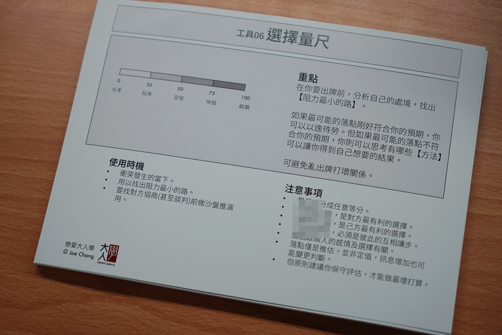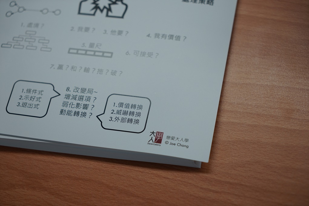 這堂課與其說是『戀愛大人學』,我覺得更像是在教導『做為一個大人』的道理,課程內容可以充分的感受到Joe融合了多本經典著作的核心觀念,並且舉出生動的案例讓我們容易理解,這些道理在職場與一般人際關係上也同樣受用,在兩天的課程中接收了這麼多精華的思維,反而讓我常常在上課中因為聯想到其他相關聯的經歷而想到出神。其中最讓我印象深刻的是局中有局的概念吧!從前我會把時間軸上的每一個局獨立出來思考,好比火車走過一站又一站一樣,個別處理每一次碰到的局,而接下來我會拉高自己的格局,看清整個局勢,讓我更有依據決定何時該進?何時該退?一定要贏或是輸也無妨?